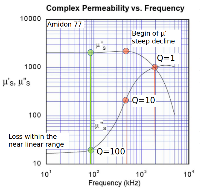 For your coil/filter design, try to keep clear of the steep rise in loss (μ"). In most cases, the safe area is to the left of the Q=100 mark.